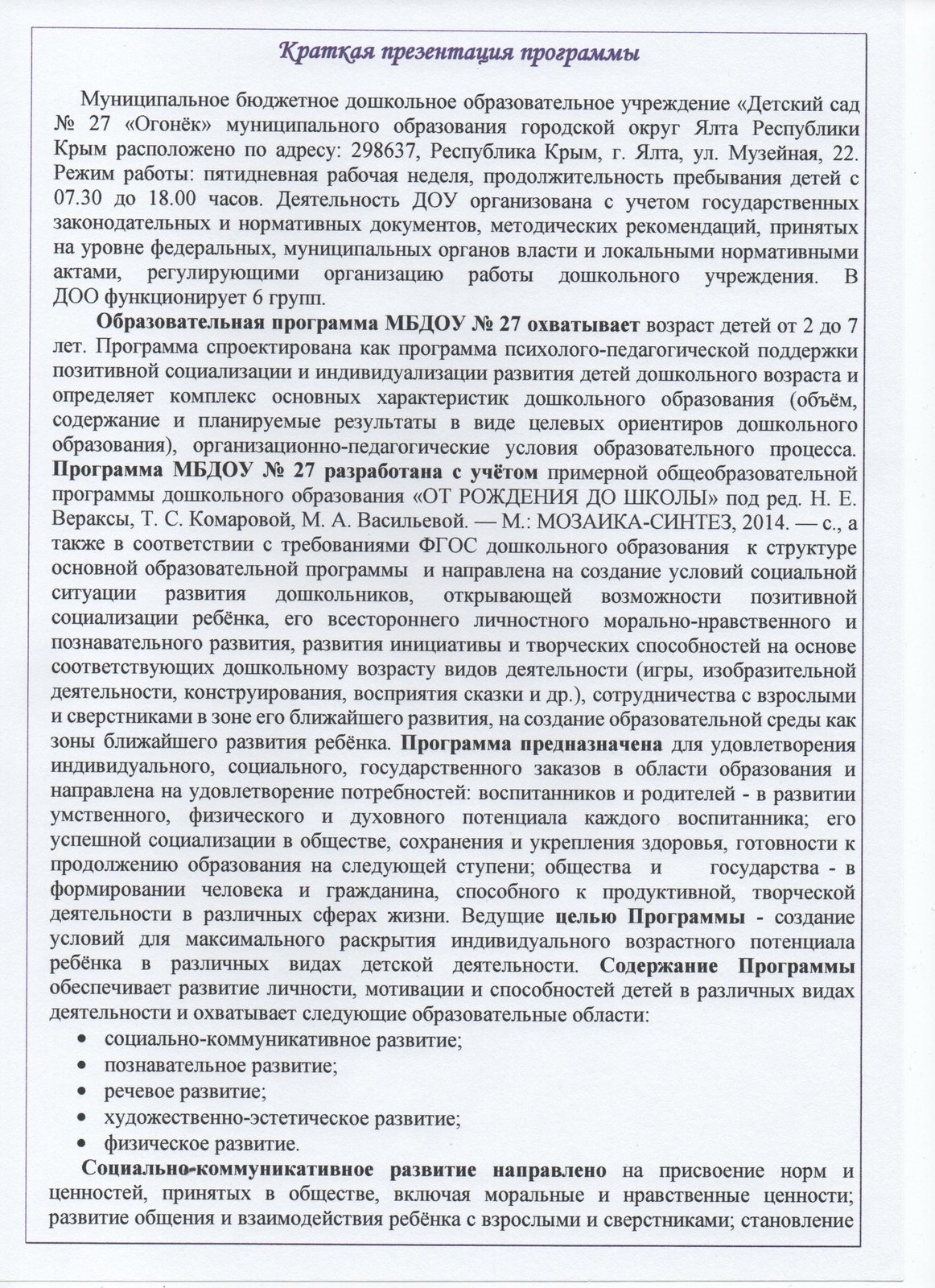 Муниципальное бюджетное дошкольное образовательное учреждение «Детский сад № 27 «Огонёк» муниципального образования городской округ Ялта Республики Крым расположено по адресу: 298637, Республика Крым, г. Ялта, ул. Музейная, 22. Режим работы: пятидневная рабочая неделя, продолжительность пребывания детей с 07.30 до 18.00 часов. Деятельность ДОУ организована с учетом государственных законодательных и нормативных документов, методических рекомендаций, принятых на уровне федеральных, муниципальных органов власти и локальными нормативными актами, регулирующими организацию работы дошкольного учреждения. В ДОО функционирует 6 групп.